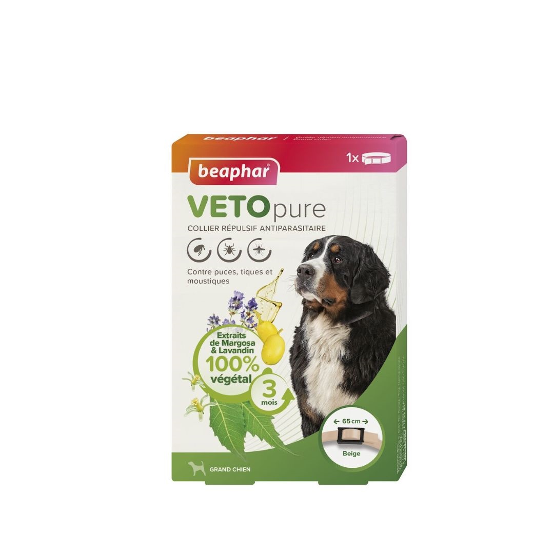 La gamme Vetopure de Beaphar est efficace contre les puces, les tiques et les moustiques. Le collier Vetopure pour chien et pour chiot a été spécialement conçu pour repousser les parasites externes. Il contient des extraits de Margosa (Neem), un arbre reconnu pour ses propriétés répulsives contre les insectes, et du Lavandin, qui dégage un agréable parfum aux vertus insectifuges. Grâce à son procédé de fabrication, ce collier assure une diffusion continue de ces extraits.