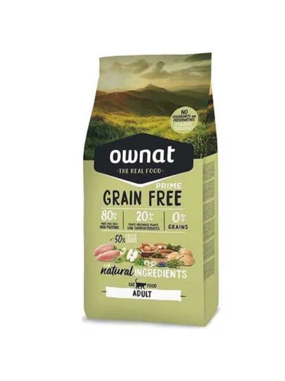 Poulet frais* (25 % min. avant l’extrusion), dinde fraîche* (25 % min. avant l’extrusion), poulet déshydraté (12 %), racines de manioc* (6 %), porc déshydraté (6 %), petits pois entiers* (5 %), graisse de volaille (préservée avec des antioxydants naturels), poisson déshydraté (anchois du Pérou, chinchard et maquereau), gousse de caroube* (3 %), pomme de terre déshydratée* (3 %), protéines de poulet hydrolysées, pulpe de betterave, œuf déshydraté* (1 %), pomme* (1 %), levure de bière* (1 %), huile de saumon (préservée avec des antioxydants naturels), sel gemme, luzerne déshydratée, fructo-oligosaccharides et mannane-oligosaccharides, algues marines déshydratées* (500 mg/kg), glucosamine (500 mg/kg), yucca shidigera, chondroïtine sulfate (100 mg/kg), airelles* (100 mg/kg), thé vert* (80 mg/kg), échinacée* (80 mg/kg), fleur de camomille* (80 mg/kg), fenouil* (80 mg/kg), thym* (80 mg/kg). *Ingrédients naturels.