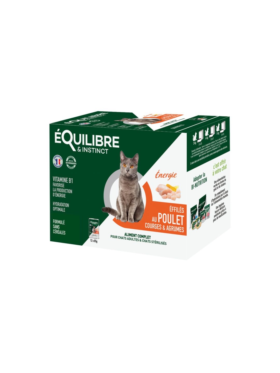 Autres ingrédients : Intègre des Sous-produits d’origine végétale*, de la Fibre de pois (1,1%), de la Courge déshydratée* (0,5% équivalent à 4% de courge), de la Poudre d’agrumes* (0,17%), et des Minéraux.