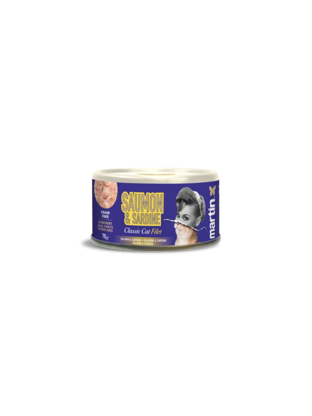 Bouillon de poisson, saumon 27,5 %, sardine 27,5 %, huile de tournesol, amidon de tapioca, agent épaississant, citrate de potassium, taurine, extrait de canneberge.