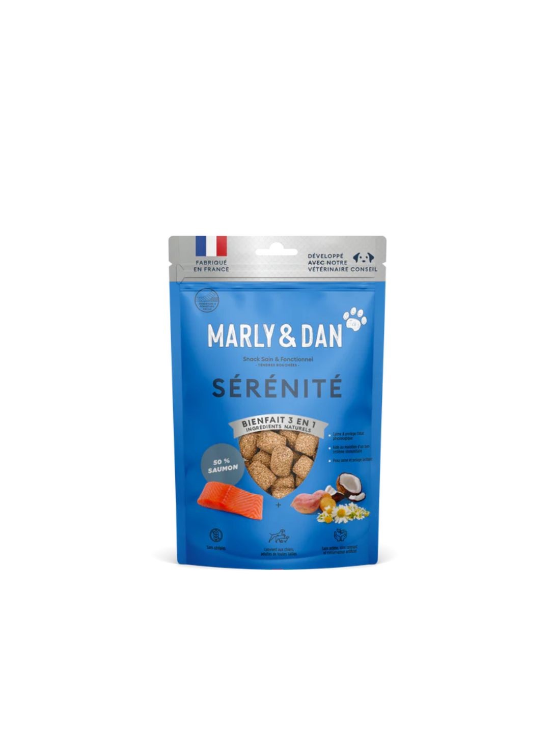 Une recette complète et naturelle, combinant les bienfaits du saumon, de la noix de coco et de la patate douce pour une digestibilité optimale. Les plantes apaisantes comme la camomille et la valériane apportent une touche de douceur supplémentaire, idéale pour soutenir le bien‑être général du chien.