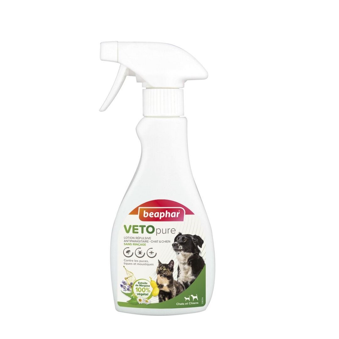 La gamme Vetopure de Beaphar est efficace contre les puces, les tiques et les moustiques. La lotion répulsive antiparasitaire de Beaphar contient trois actifs d’origine végétale : du Pyrèthre végétal, extrait d’une plante connue pour ses effets répulsifs ; du Margosa, provenant du Neem et réputé pour son action contre les puces, les tiques et les moustiques ; et du Lavandin, qui dégage un agréable parfum de lavande aux vertus insectifuges.