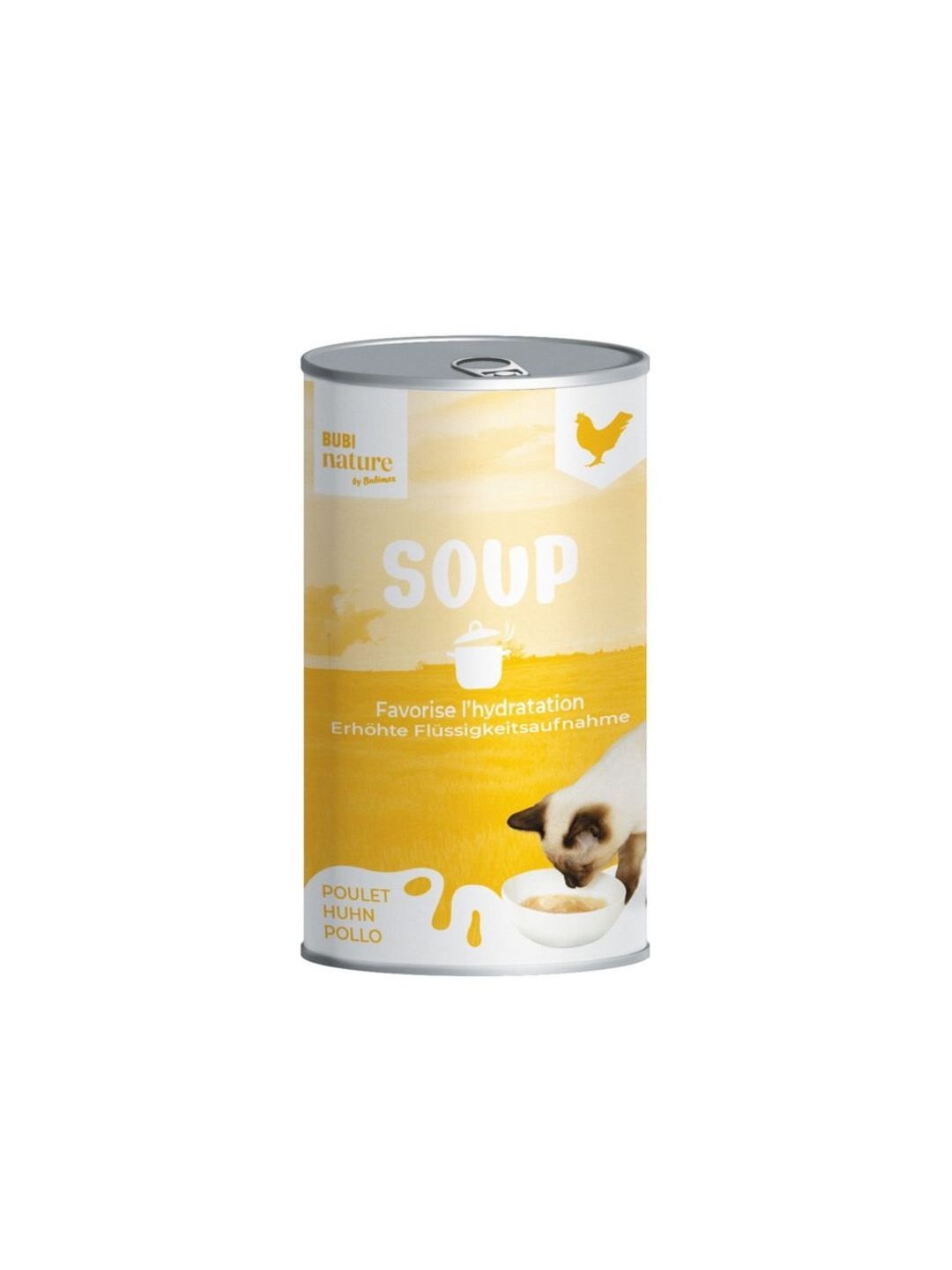 Poulet : Bouillon 95 % (eau, extrait de levure, carboxyméthylcellulose, gomme de guar, gomme xanthane, levures, foies de poulet hydrolysés, sucres, acides aminés, sels de phosphate, tocophérols mixtes, antiagglomérant, extrait végétal, taurine), poulet 5 %.